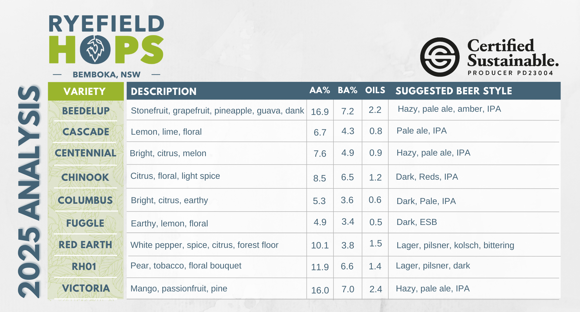 Ryefield Hops is A family venture utilising ex-dairy farming land. we are dedicated to producing certified sustainable hops for the Australian craft beer market.